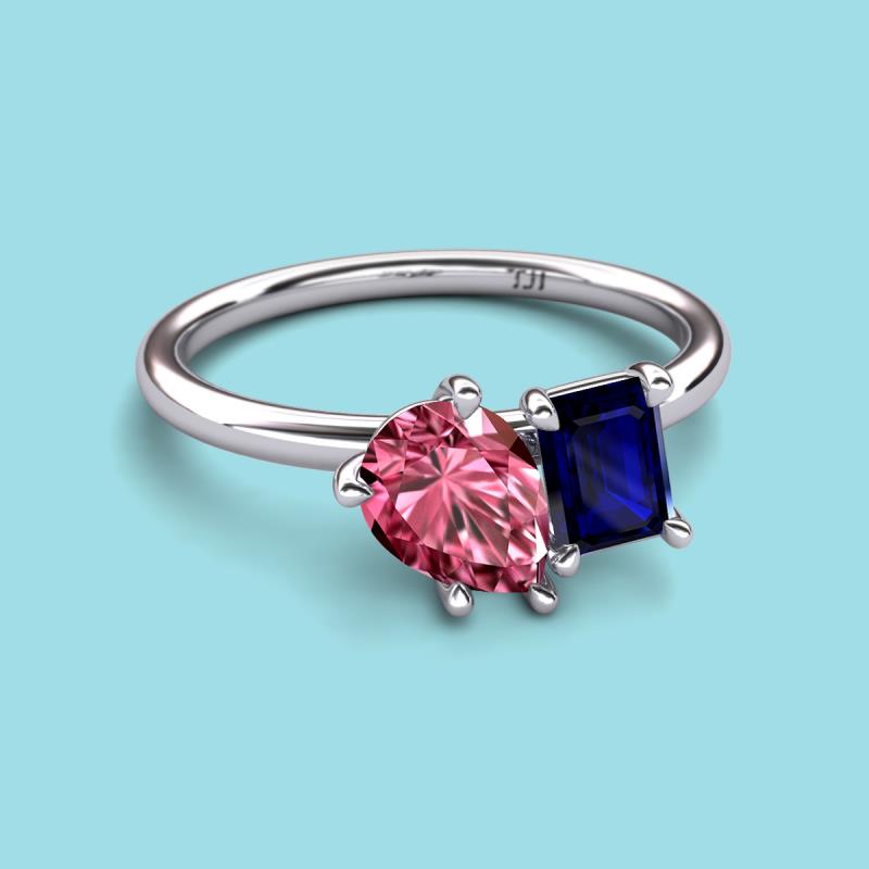 Find a beautiful symbol of everlasting love, with our new collection of duo two-stone ring. A pair of Pear Shape Pink Tourmaline shimmering alongside of a luminous Emerald Shape Blue Sapphire crafted beautifully is all set to represent two of you together.