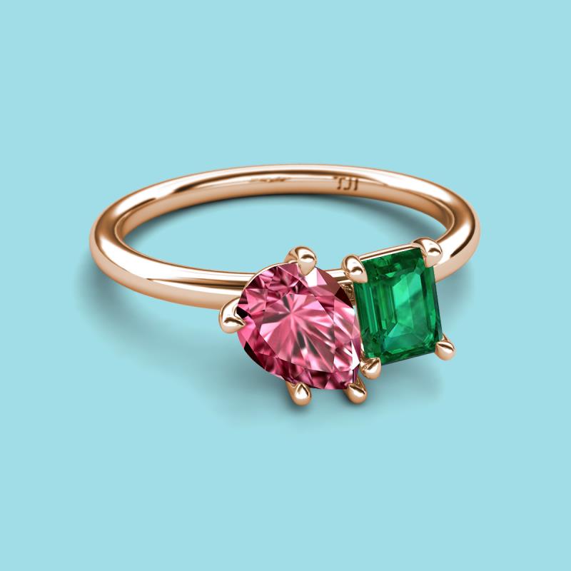 Find a beautiful symbol of everlasting love, with our new collection of duo two-stone ring. A pair of Pear Shape Pink Tourmaline shimmering alongside of a luminous Emerald Shape Emerald crafted beautifully is all set to represent two of you together.