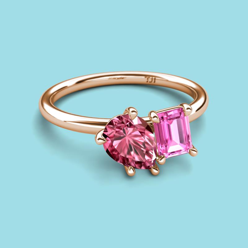 Find a beautiful symbol of everlasting love, with our new collection of duo two-stone ring. A pair of Pear Shape Pink Tourmaline shimmering alongside of a luminous Emerald Shape Pink Sapphire crafted beautifully is all set to represent two of you together.