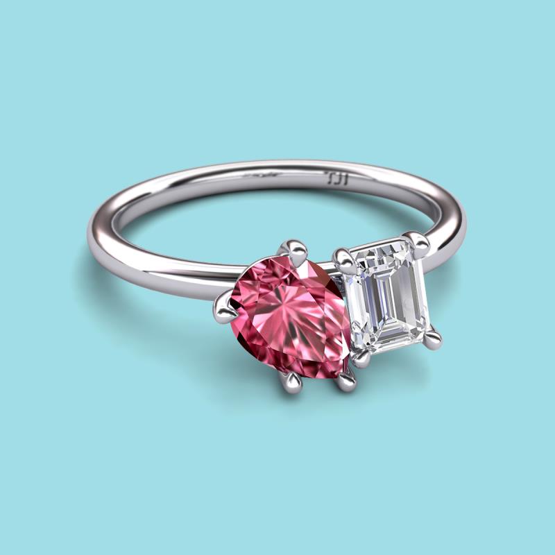 Find a beautiful symbol of everlasting love, with our new collection of duo two-stone ring. A pair of Pear Shape Pink Tourmaline shimmering alongside of a luminous Emerald Shape White Sapphire crafted beautifully is all set to represent two of you together.