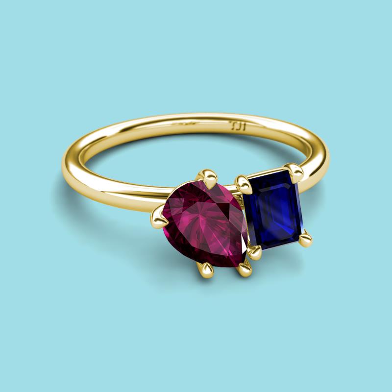 Pear Shape Rhodolite Garnet & Emerald Shape Blue Sapphire 2.35 ctw Four Prong Womens 2 Stone Duo Engagement Ring 18K Yellow Gold More Details ...
