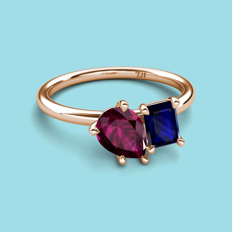 Find a beautiful symbol of everlasting love, with our new collection of duo two-stone ring. A pair of Pear Shape Rhodolite Garnet shimmering alongside of a luminous Emerald Shape Blue Sapphire crafted beautifully is all set to represent two of you together.