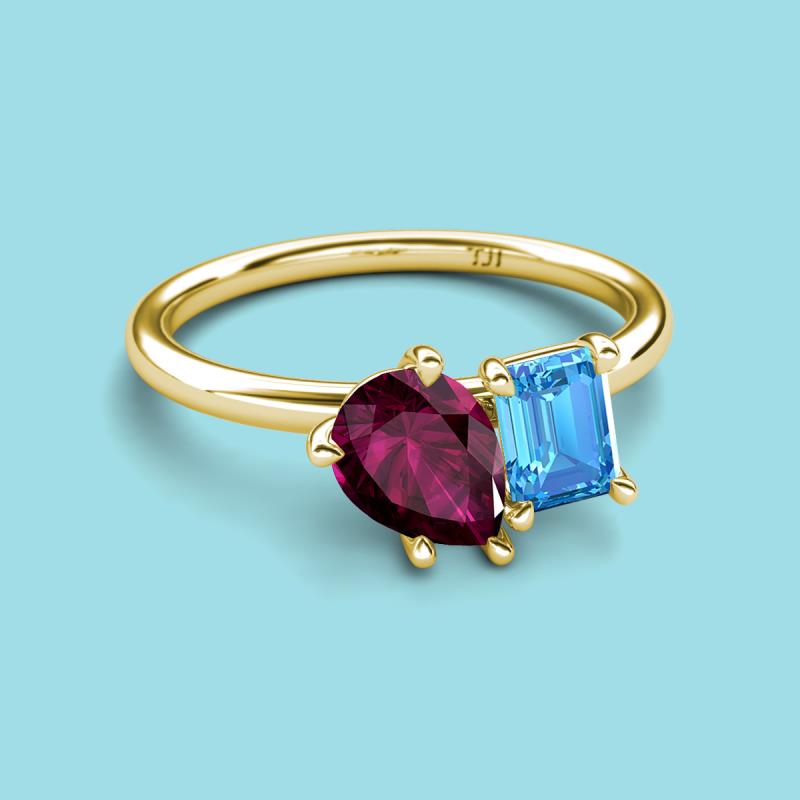 Pear Shape Rhodolite Garnet & Emerald Shape Blue Topaz 2.75 ctw Four Prong Womens 2 Stone Duo Engagement Ring 18K Yellow Gold More Details ...