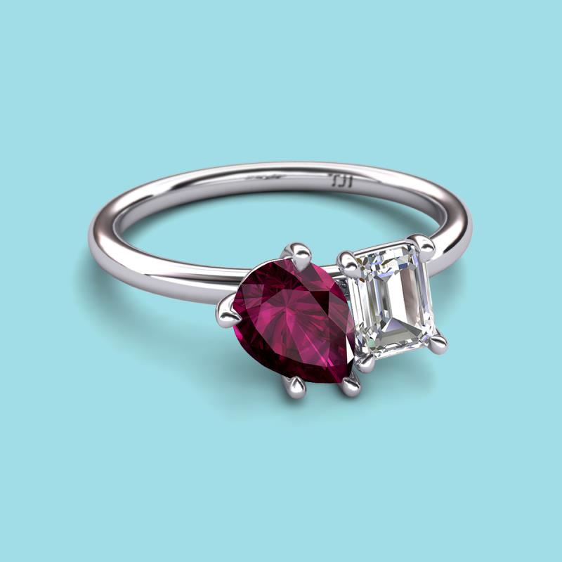 Find a beautiful symbol of everlasting love, with our new collection of duo two-stone ring. A pair of Pear Shape Rhodolite Garnet shimmering alongside of a luminous Emerald Shape IGI Certified Lab Grown Diamond crafted beautifully is all set to represent two of you together.
