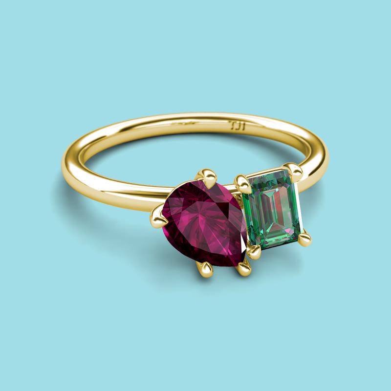 Find a beautiful symbol of everlasting love, with our new collection of duo two-stone ring. A pair of Pear Shape Rhodolite Garnet shimmering alongside of a luminous Emerald Shape Lab Created Alexandrite crafted beautifully is all set to represent two of you together.