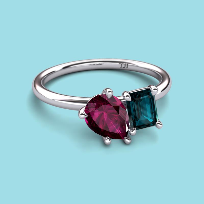 Find a beautiful symbol of everlasting love, with our new collection of duo two-stone ring. A pair of Pear Shape Rhodolite Garnet shimmering alongside of a luminous Emerald Shape London Blue Topaz crafted beautifully is all set to represent two of you together.