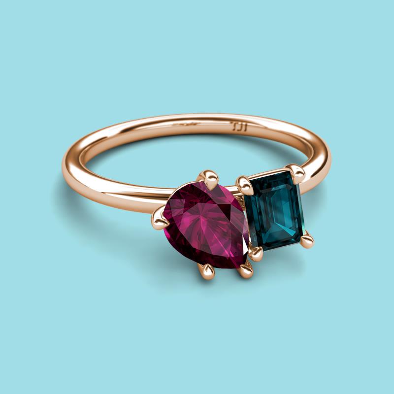 Find a beautiful symbol of everlasting love, with our new collection of duo two-stone ring. A pair of Pear Shape Rhodolite Garnet shimmering alongside of a luminous Emerald Shape London Blue Topaz crafted beautifully is all set to represent two of you together.