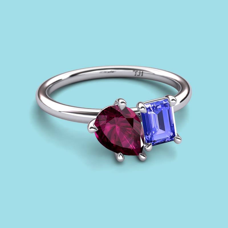 Find a beautiful symbol of everlasting love, with our new collection of duo two-stone ring. A pair of Pear Shape Rhodolite Garnet shimmering alongside of a luminous Emerald Shape Tanzanite crafted beautifully is all set to represent two of you together.