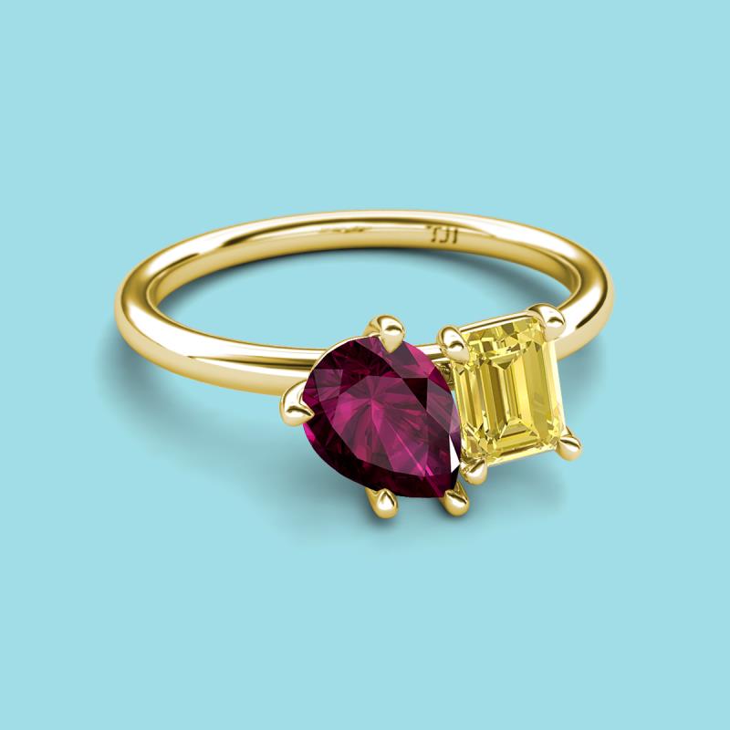 Find a beautiful symbol of everlasting love, with our new collection of duo two-stone ring. A pair of Pear Shape Rhodolite Garnet shimmering alongside of a luminous Emerald Shape Yellow Sapphire crafted beautifully is all set to represent two of you together.