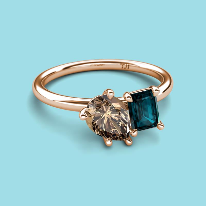 Find a beautiful symbol of everlasting love, with our new collection of duo two-stone ring. A pair of Pear Shape Smoky Quartz shimmering alongside of a luminous Emerald Shape London Blue Topaz crafted beautifully is all set to represent two of you together.