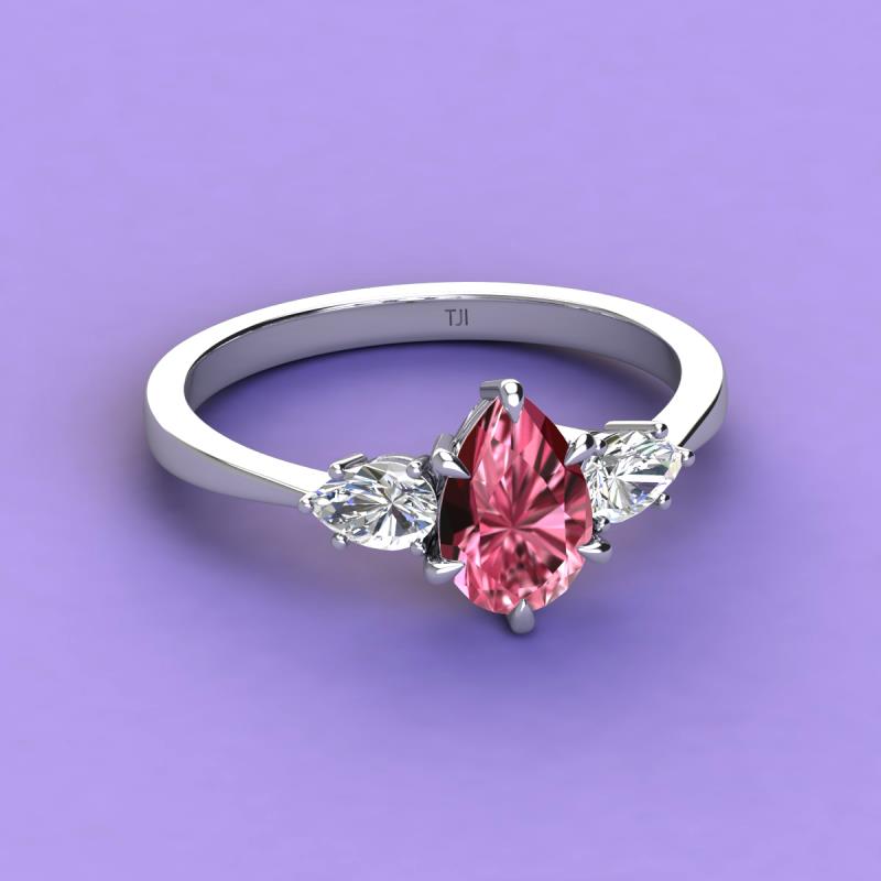 1.90 ctw Pink Tourmaline Pear Shape (9x7 mm) accented Natural Diamond Three Stone Women Engagement Ring using Tiger Claw Setting in 18K White Gold More Details ...