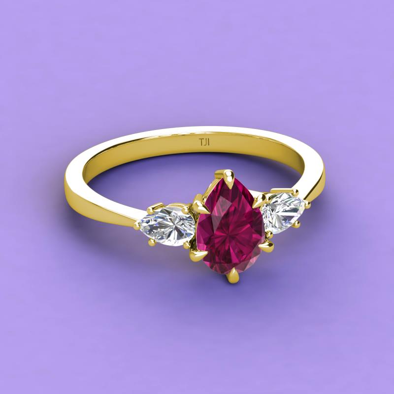 Pear Shape (9x6 mm) Rhodolite Garnet and Lab Grown Diamond 1.85 ctw Tiger Claw Set Six Prong Women Three Stone Engagement Ring 18K Yellow Gold More Details ...