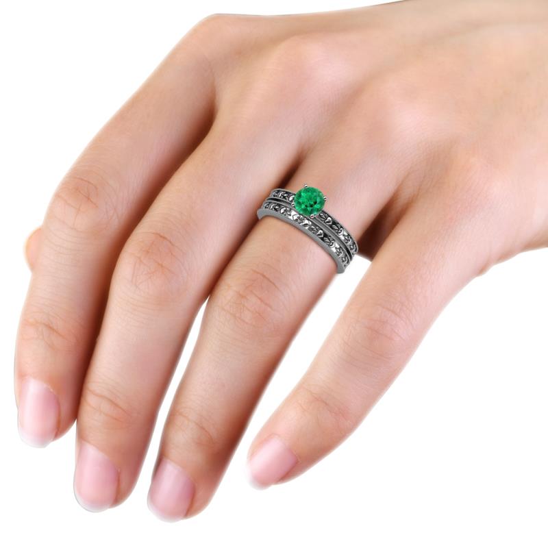 A perfect Ring to show your love and devotion, this Vintage inspired Emerald Solitaire Engagement Ring is accompanied by matching Wedding Band,both of which features motif of embossed hearts all around the shank with milgrain edges.