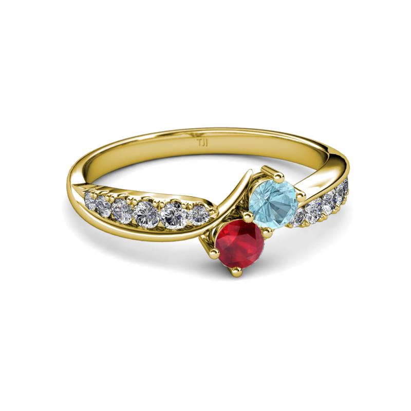 Aquamarine and Ruby 2 Stone with Side Diamonds Bypass Engagement Ring 0.76 ct tw in 14K Yellow Gold. More Details ...
