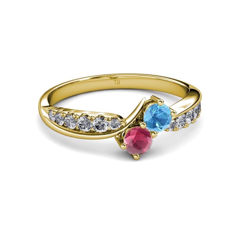 Blue Topaz and Rhodolite Garnet 2 Stone with Side Diamonds Bypass Engagement Ring 0.84 ct tw in 14K Yellow Gold. More Details ...