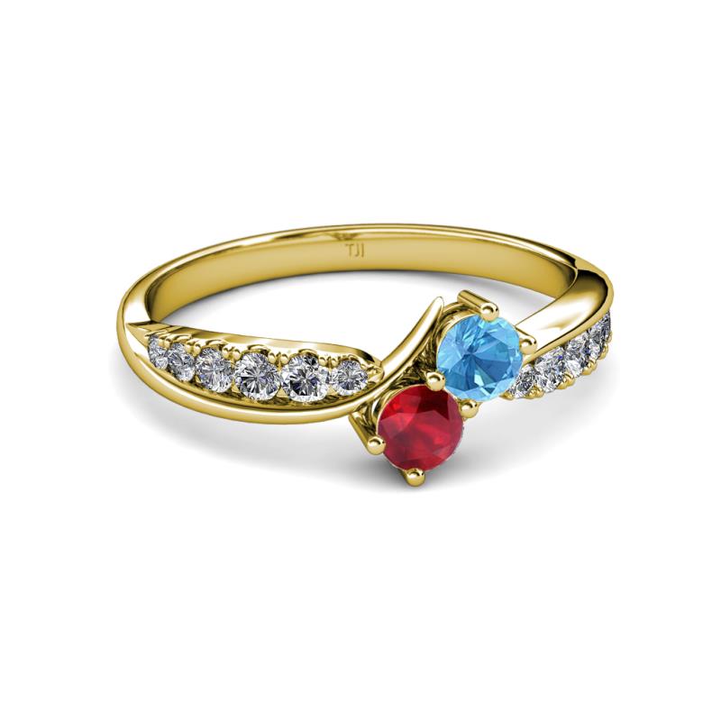 Blue Topaz and Ruby 2 Stone with Side Diamonds Bypass Engagement Ring 0.78 ct tw in 14K Yellow Gold. More Details ...
