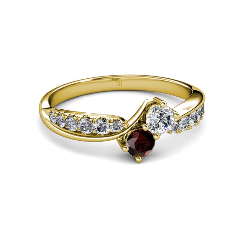 0.87 ctw Lab Grown Diamond & Red Garnet accented Side Lab Grown Diamond Two Stone Bypass Engagement Ring in 10K Yellow Gold. More Details ...