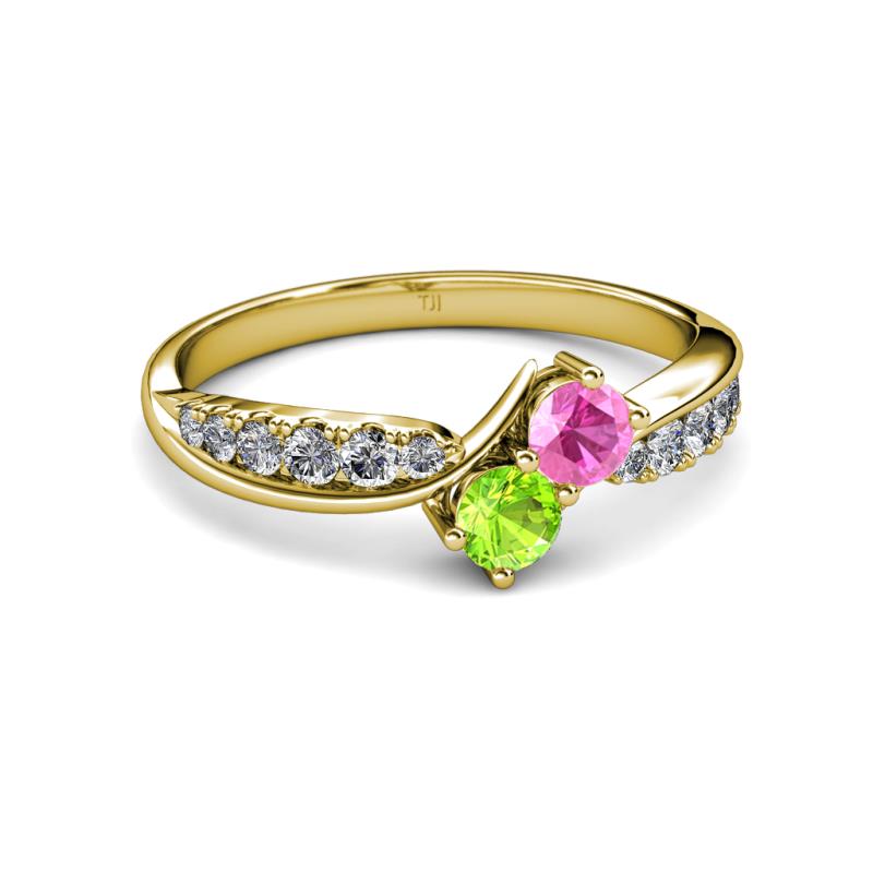 Pink Sapphire and Peridot 2 Stone with Side Diamonds Bypass Engagement Ring 0.88 ct tw in 14K Yellow Gold. More Details ...
