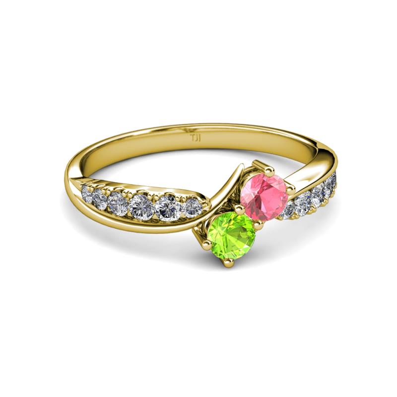 Pink Tourmaline and Peridot 2 Stone with Side Diamonds Bypass Engagement Ring 0.82 ct tw in 14K Yellow Gold. More Details ...