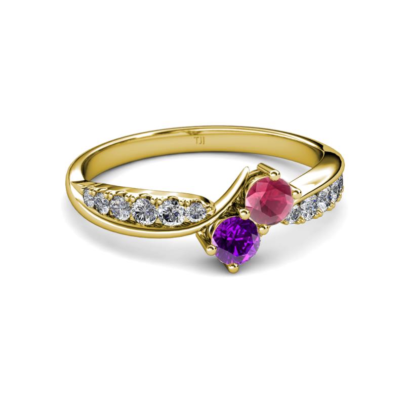 Rhodolite Garnet and Amethyst 2 Stone with Side Diamonds Bypass Engagement Ring 0.82 ct tw in 14K Yellow Gold. More Details ...