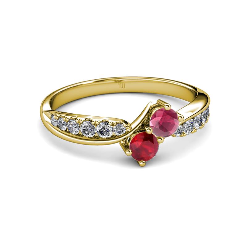 Rhodolite Garnet and Ruby 2 Stone with Side Diamonds Bypass Engagement Ring 0.88 ct tw in 14K Yellow Gold. More Details ...