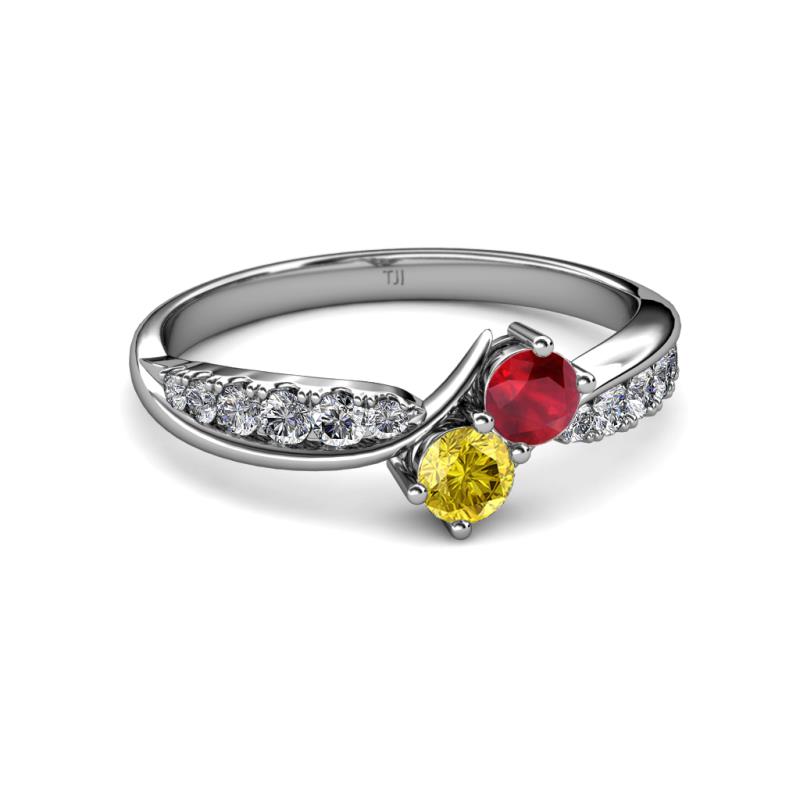 Ruby and Yellow Sapphire 2 Stone with Side Diamonds Bypass Engagement Ring 0.82 ct tw in 14K White Gold. More Details ...