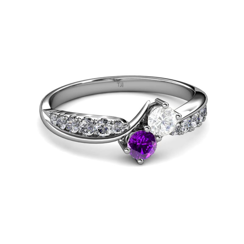 White Sapphire and Amethyst 2 Stone with Side Diamonds Bypass Engagement Ring 0.76 ct tw in 14K White Gold. More Details ...