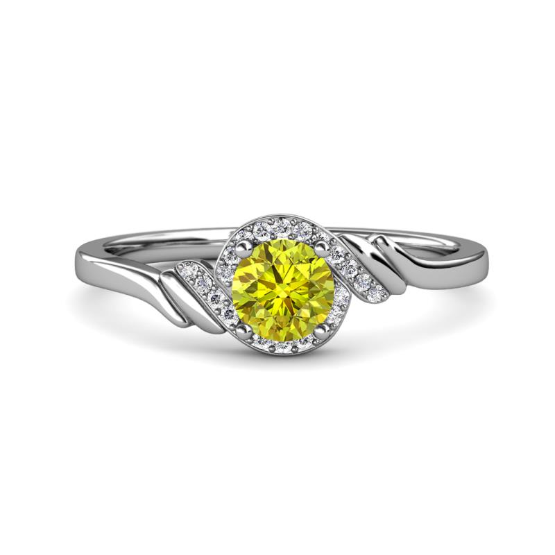 This Feminine style Engagement Ring features a 4 Prong Center Yellow Diamond wrapped with single row halo of Pave Set White Diamonds and twisting bypass shank completes this sophisticated design.