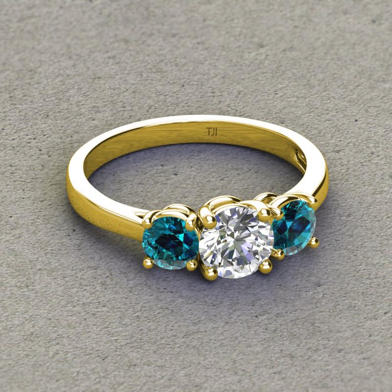 Show your Love with this Gorgeous 2.00 ctw GIA Certified Three Stone Ring featuring a Center Round Natural Diamond flanked by Blue Diamond on either sides beautifully crafted in 14K Yellow Gold representing your past, present & future together.