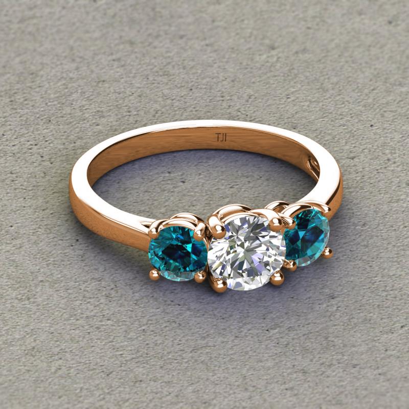 Show your Love with this Gorgeous 2.00 ctw GIA Certified Three Stone Ring featuring a Center Round Natural Diamond flanked by Blue Diamond on either sides beautifully crafted in 14K Rose Gold representing your past, present & future together.