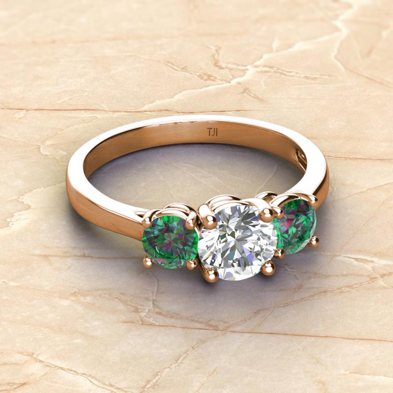 Show your Love with this Gorgeous 2.35 ctw GIA Certified Three Stone Ring featuring a Center Round Natural Diamond flanked by Lab Created Alexandrite on either sides beautifully crafted in 14K Rose Gold representing your past, present & future together