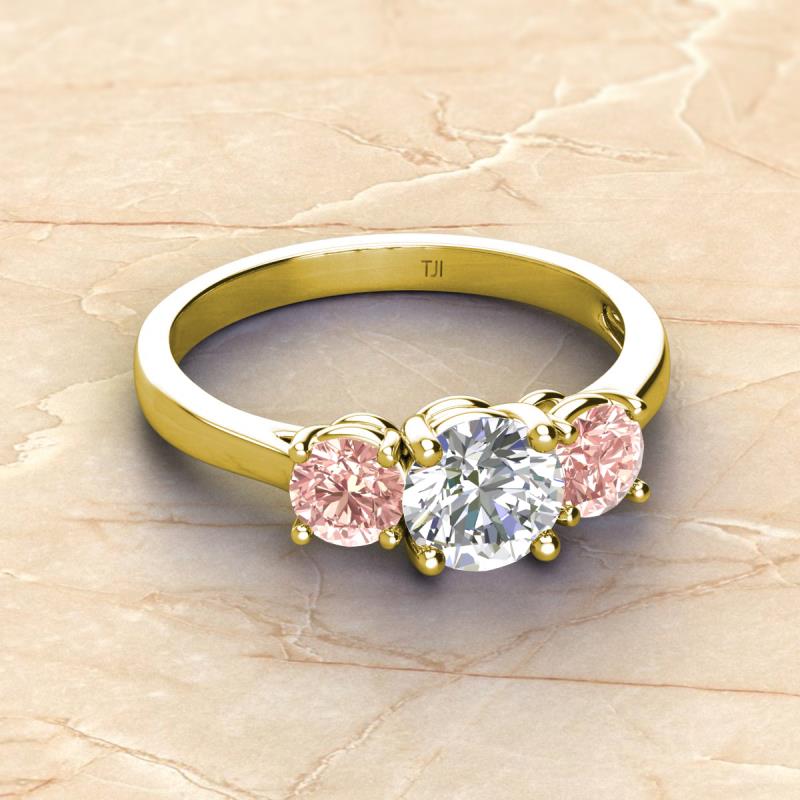 Show your Love with this Gorgeous 2.21 ctw GIA Certified Three Stone Ring featuring a Center Round Natural Diamond flanked by Morganite on either sides beautifully crafted in 14K Yellow Gold representing your past, present & future together.