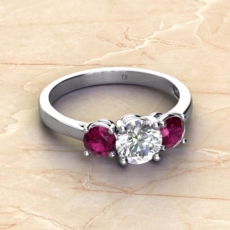 Show your Love with this Gorgeous 2.25 ctw GIA Certified Three Stone Ring featuring a Center Round Natural Diamond flanked by Rhodolite Garnet on either sides beautifully crafted in 14K White Gold representing your past, present & future together.