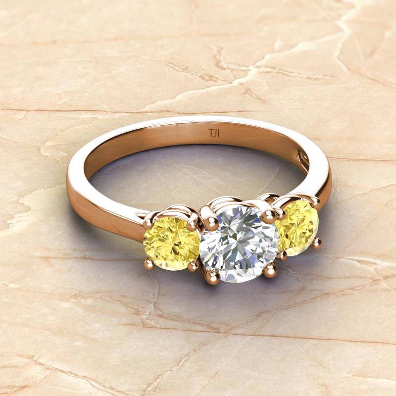 Show your Love with this Gorgeous 2.31 ctw GIA Certified Three Stone Ring featuring a Center Round Natural Diamond flanked by Yellow Sapphire on either sides beautifully crafted in 14K Rose Gold representing your past, present & future together.
