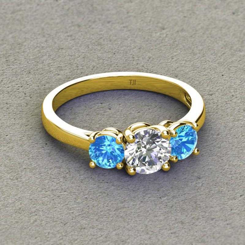 Show your Love with this Gorgeous 2.00 ctw Three Stone Ring featuring an IGI Certified Center Lab Grown Diamond flanked by Blue Topaz on either sides beautifully crafted in 14K Yellow Gold representing your past, present & future together.
