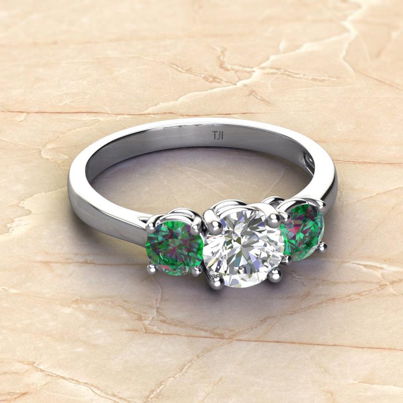 Show your Love with this Gorgeous 2.40 ctw Three Stone Ring featuring a IGI Certified Center Lab Grown Diamond flanked by Lab Created Alexandrite on either sides beautifully crafted in 18K White Gold representing your past, present & future together.
