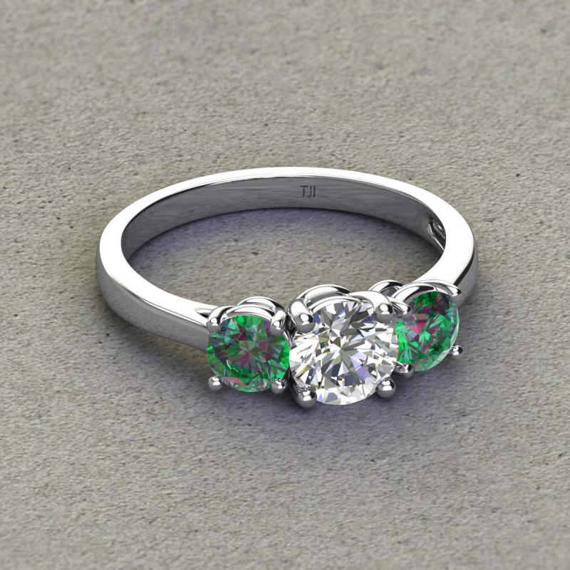 Show your Love with this Gorgeous 2.10 ctw Three Stone Ring featuring an IGI Certified Center Lab Grown Diamond flanked by Lab Created Alexandrite on either sides beautifully crafted in 18K White Gold representing your past, present & future together.