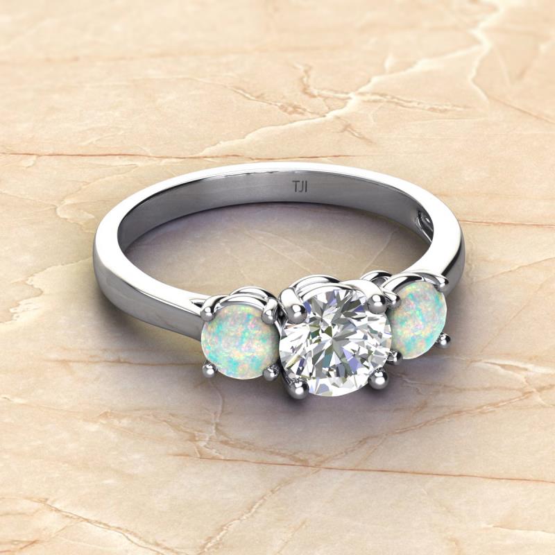 Show your Love with this Gorgeous 2.00 ctw Three Stone Ring featuring a IGI Certified Center Lab Grown Diamond flanked by Opal on either sides beautifully crafted in 14K White Gold representing your past, present & future together.