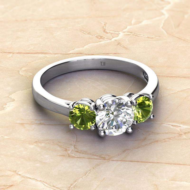 Show your Love with this Gorgeous 2.30 ctw Three Stone Ring featuring a IGI Certified Center Lab Grown Diamond flanked by Peridot on either sides beautifully crafted in Platinum representing your past, present & future together.