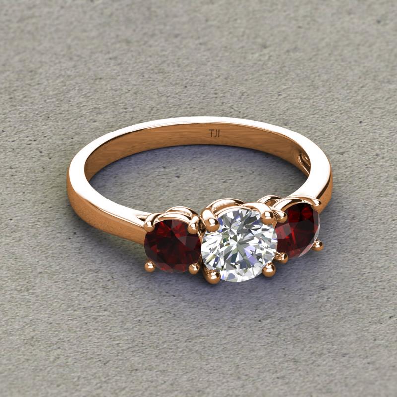 Show your Love with this Gorgeous 2.26 ctw Three Stone Ring featuring an IGI Certified Center Lab Grown Diamond flanked by Red Garnet on either sides beautifully crafted in 18K Rose Gold representing your past, present & future together.