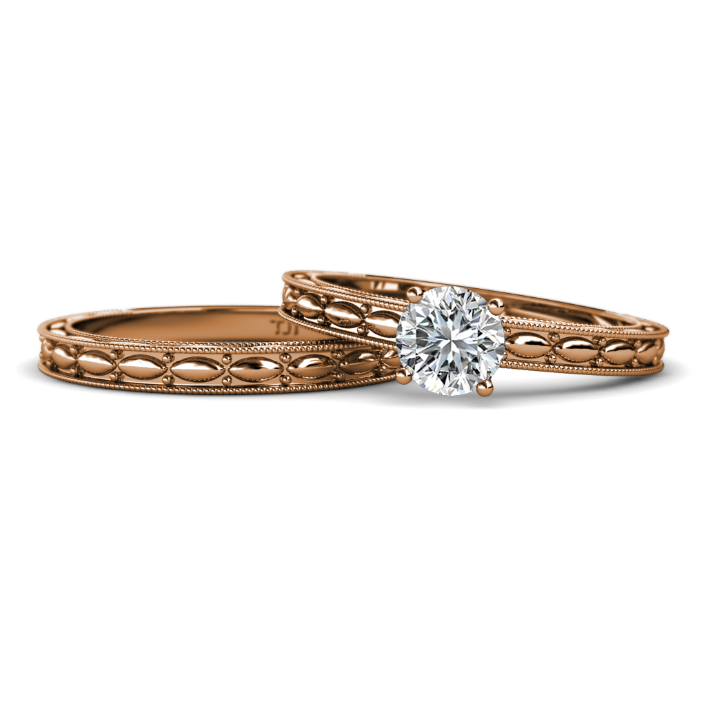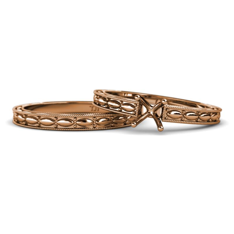 This Vintage inspired Semi Mount Solitaire Engagement Ring features motif of Marquise design all around the shank with a classy finishing touch of milgrain edges accompanied by a matching Wedding Band.
