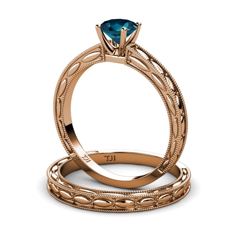 This Infinity Blue Diamond Solitaire Engagement Ring is accompanied by matching Wedding Band,both of which features interwined strands of metal forming infinity symbols representing limitless love.