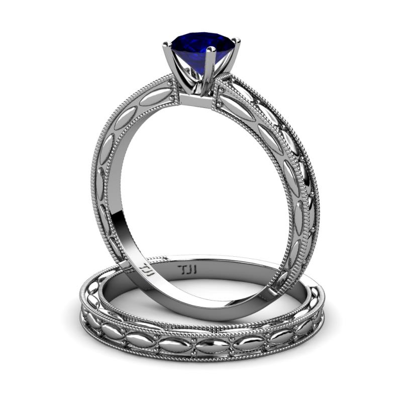 This Infinity Blue Sapphire Solitaire Engagement Ring is accompanied by matching Wedding Band,both of which features interwined strands of metal forming infinity symbols representing limitless love.