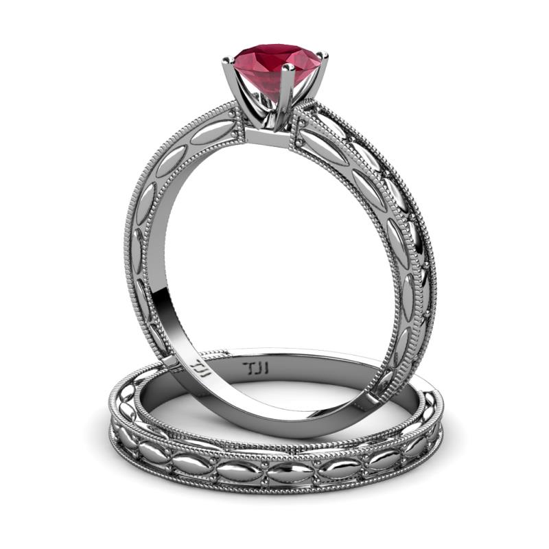 This Infinity Rhodolite Garnet Solitaire Engagement Ring is accompanied by matching Wedding Band,both of which features interwined strands of metal forming infinity symbols representing limitless love.