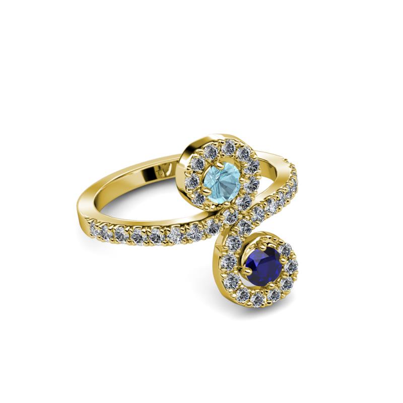Aquamarine and Blue Sapphire 2 Stone with Side Diamonds Bypass Engagement Ring 0.72 Carat tw in 14K Yellow Gold. More Details ...