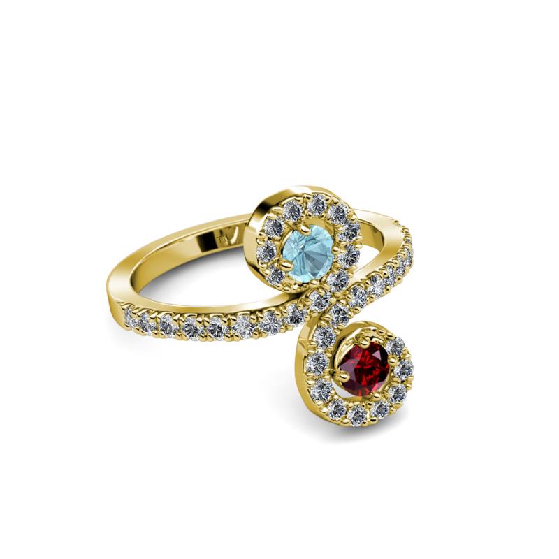 Aquamarine and Ruby 2 Stone with Side Diamonds Bypass Engagement Ring 0.73 Carat tw in 14K Yellow Gold. More Details ...
