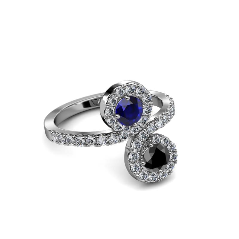 A divine symbol of togetherness, where one stone represents love and one friendship while each end of the ring swirls around the marvelous combination of Black Diamond & Blue Sapphire meeting above and below, rather than in the center.