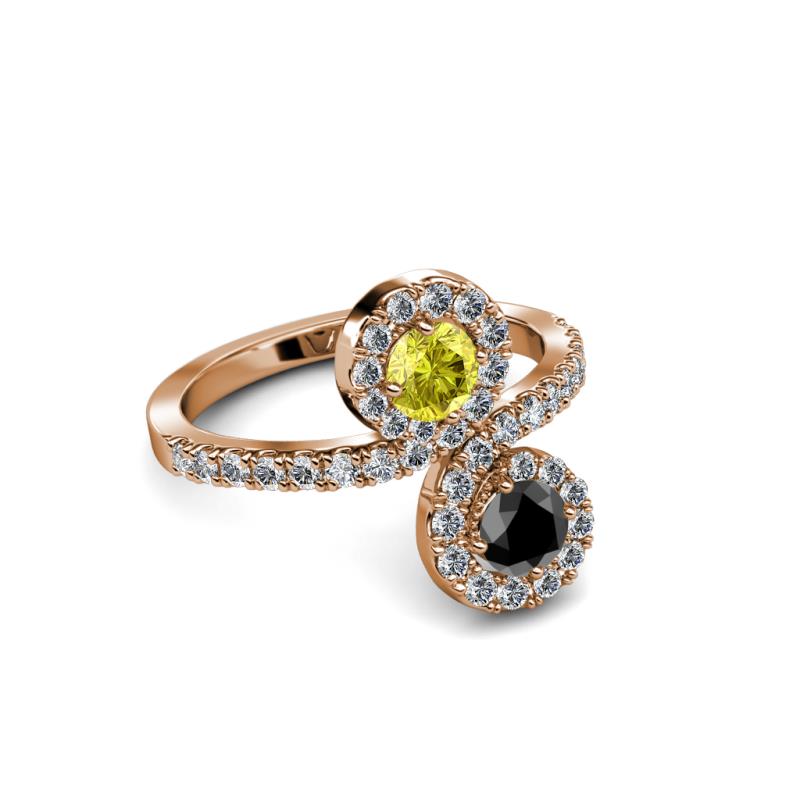 A divine symbol of togetherness, where one stone represents love and one friendship while each end of the ring swirls around the marvelous combination of Black Diamond & Yellow Diamond meeting above and below, rather than in the center.