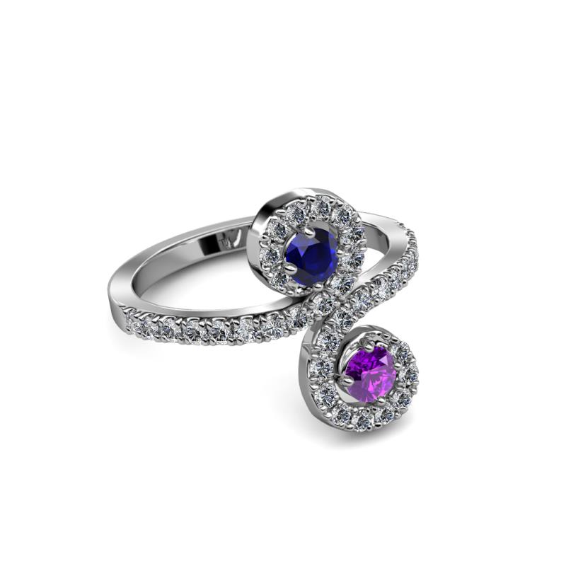 Blue Sapphire and Amethyst 2 Stone with Side Diamonds Bypass Engagement Ring 0.72 Carat tw in 14K White Gold. More Details ...