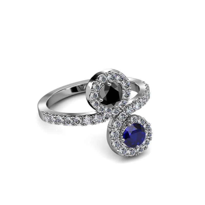 A divine symbol of togetherness, where one stone represents love and one friendship while each end of the ring swirls around the marvelous combination of Blue Sapphire & Black Diamond meeting above and below, rather than in the center.